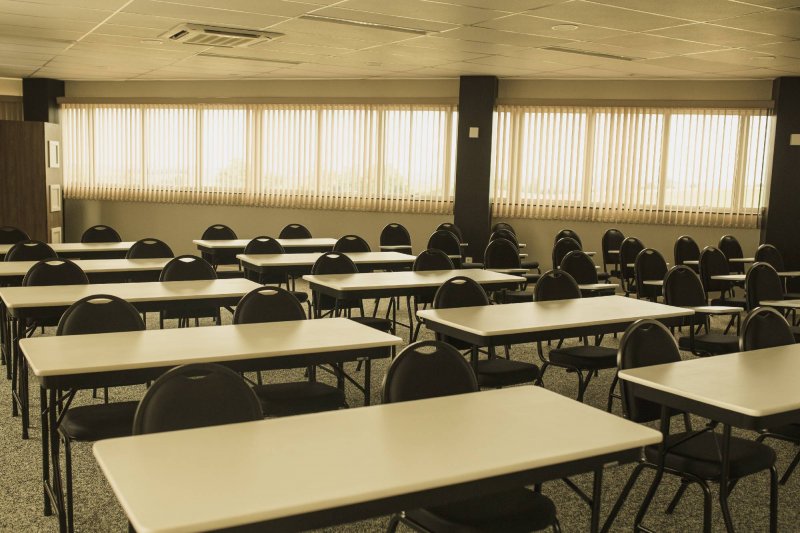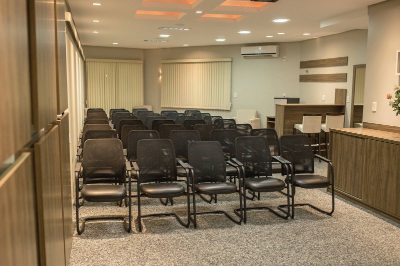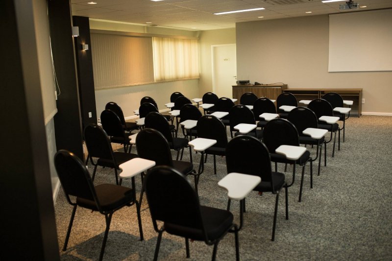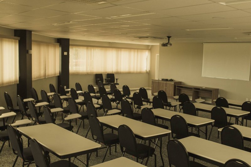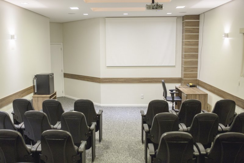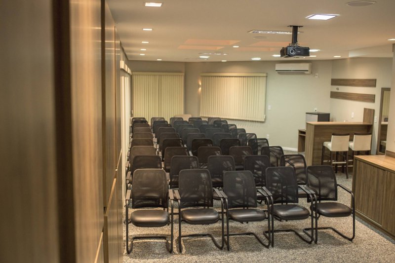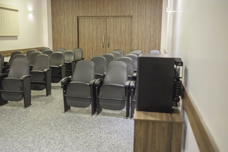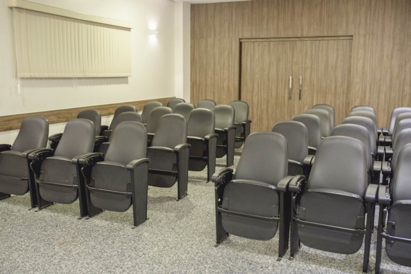 Auditório com projetor multimídia, telão, sistema integrado de som, capacidade para 30 pessoas, cadeiras fixas em formato de auditório com prancheta de apoio e climatizadores.