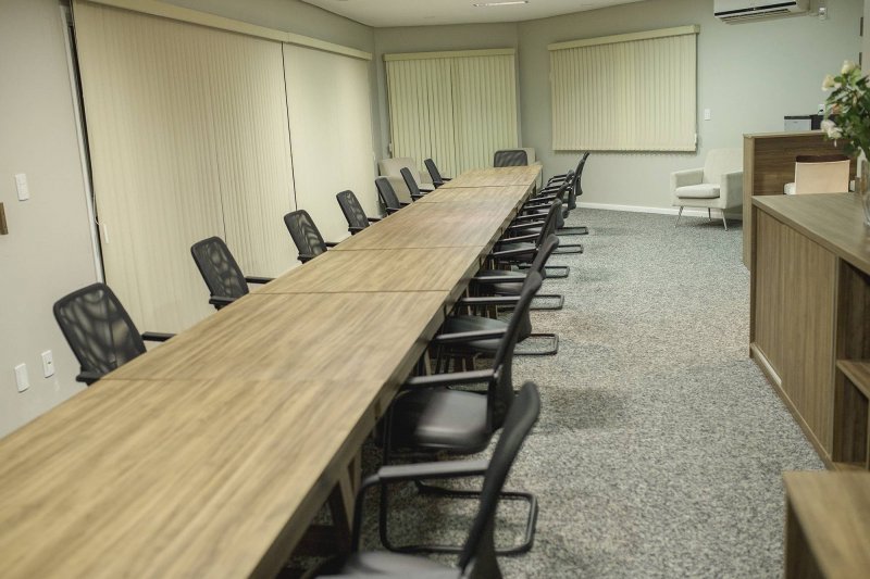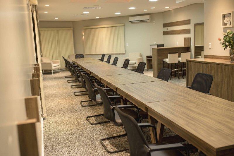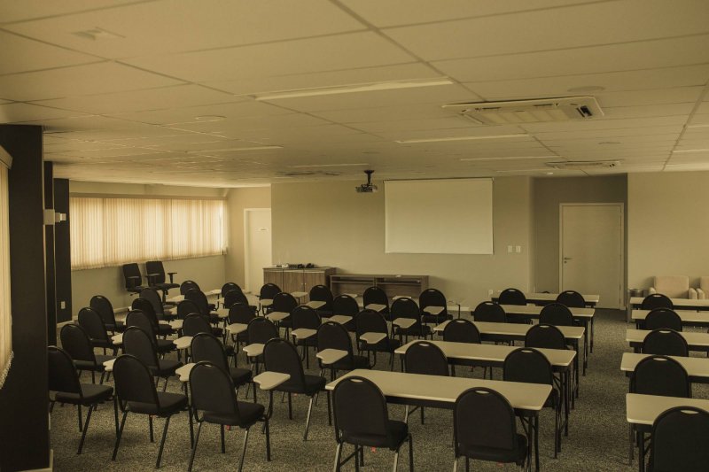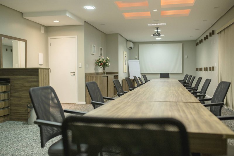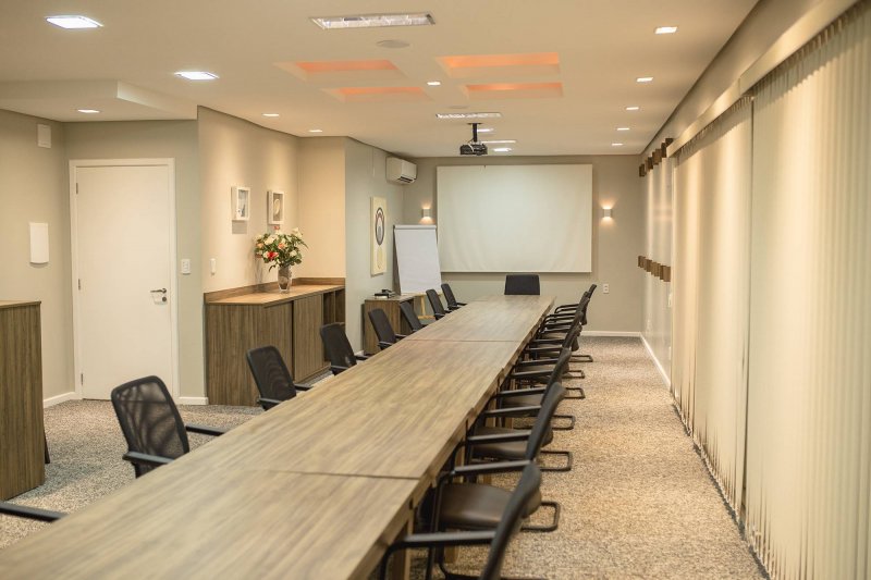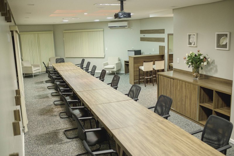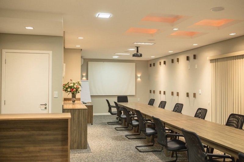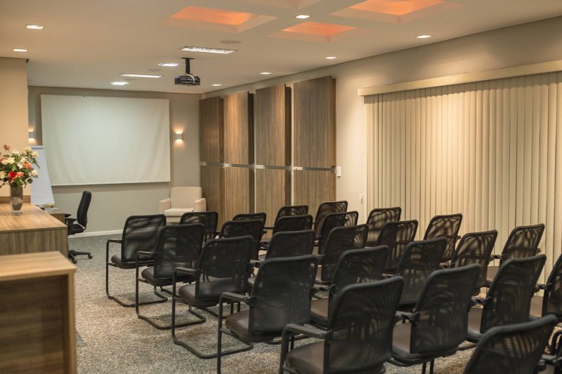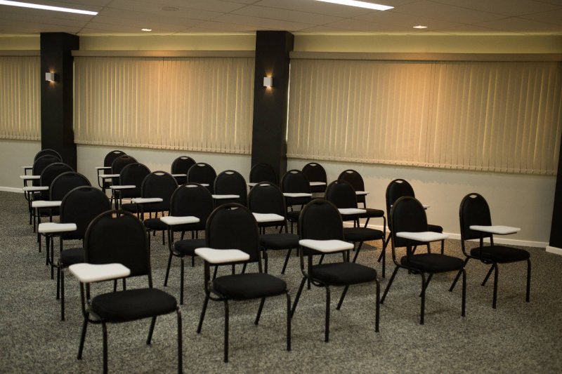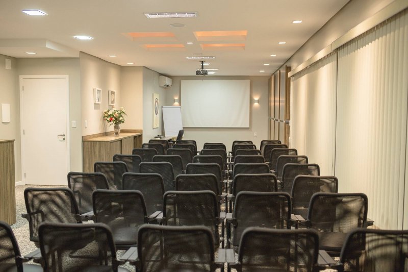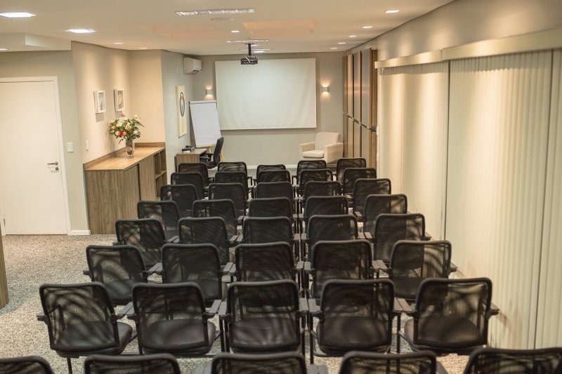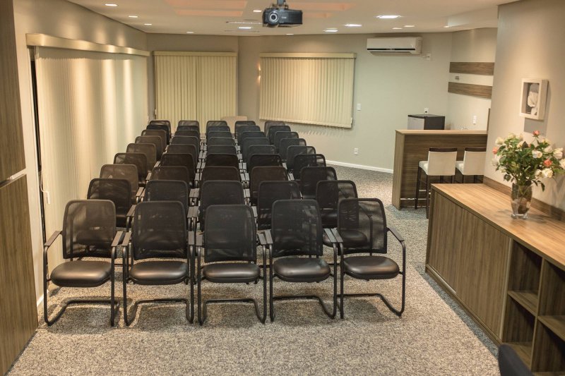 Auditório com projetor multimídia, telão, sistema integrado de som, com capacidade para 50 pessoas, cadeiras ergonômicas móveis, mesas grandes opcionais. Climatizadores, e possibilidade para montagem de layouts.